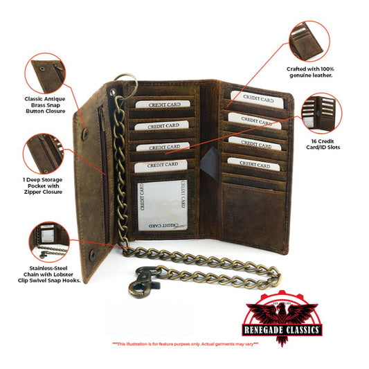 BWC233 DISTRESSED BROWN LEATHER LONG TRI-FOLD BIKER WALLET