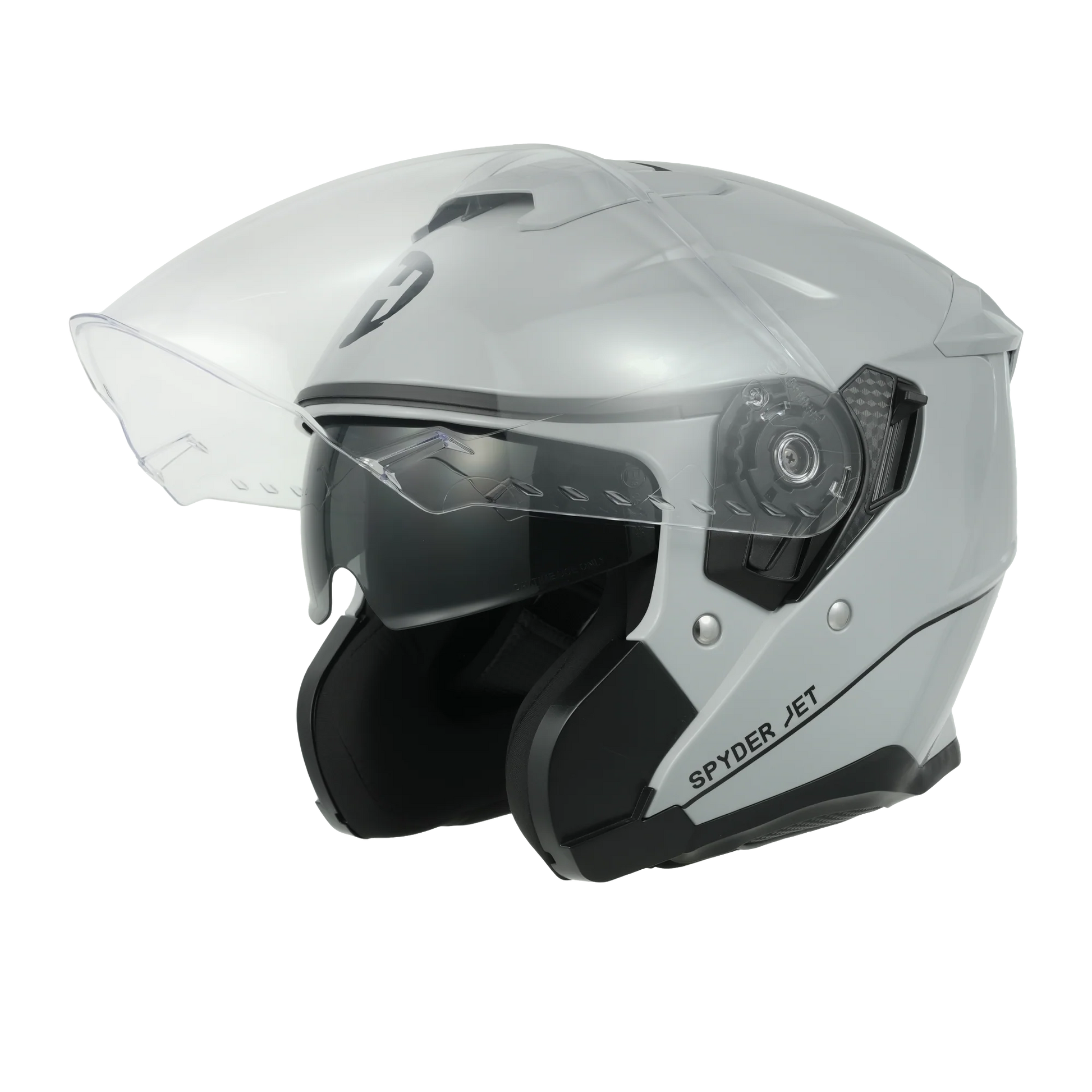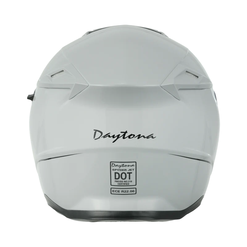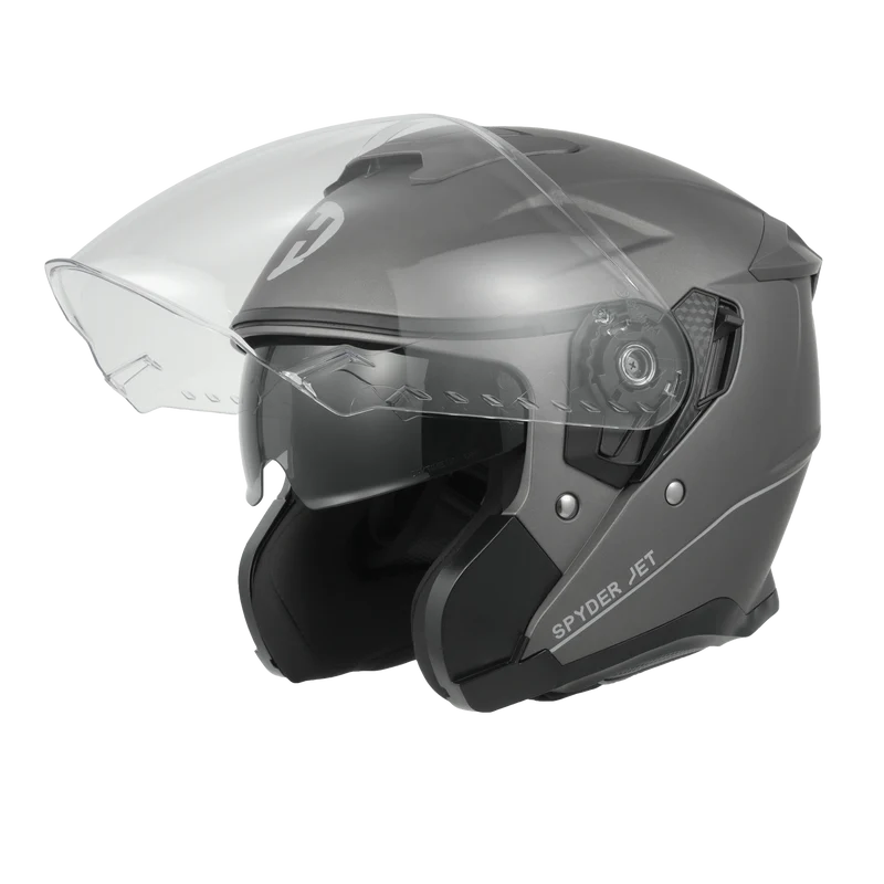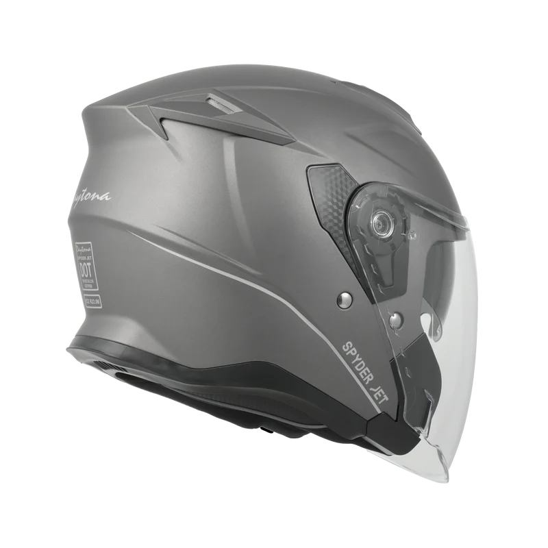 Our D.O.T. And ECE Daytona Spyder Jet Helmet In The Cool Grey Finish, Meets And Exceeds D.O.T. FMVSS 218 And ECE 22R06 Standards!! Features A Dual Shield System; Outer Anti-Scratch Clear Shield And Inner Anti-Scratch Retractable Smoke Shield. Also Has A Quick Release Lock Retention System; One Finger Release Lever For Easy Detachment And A Removable, Hand Washable Interior (Moisture Wicking Fabric). Bluetooth Compatible. Cloth Draw String Bag Included. Sizes Range From XS-2XL.