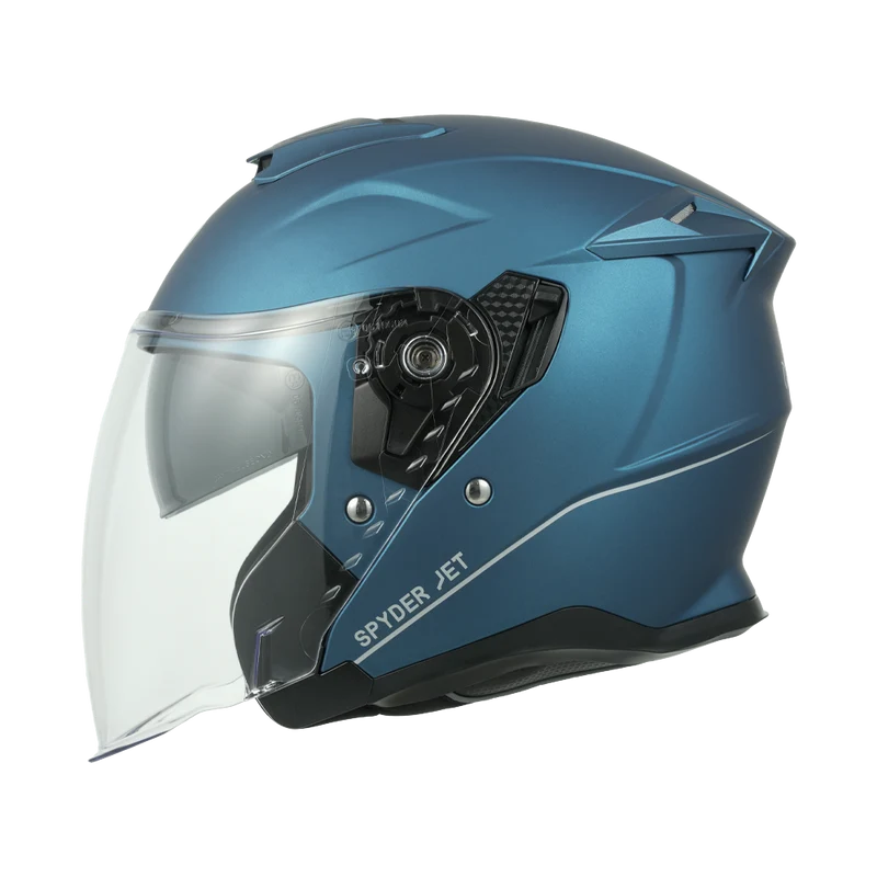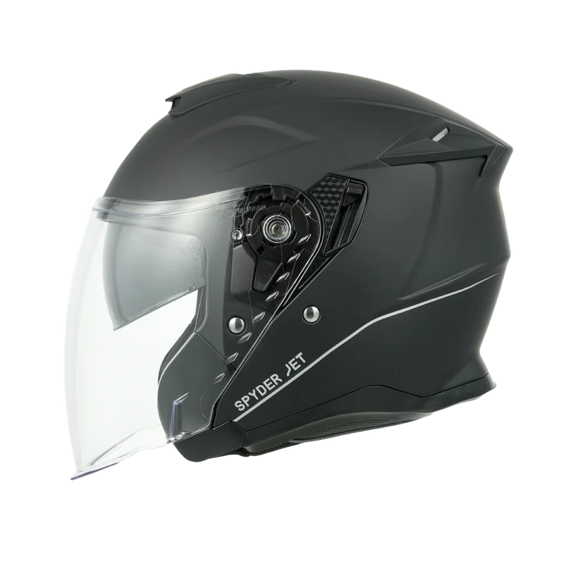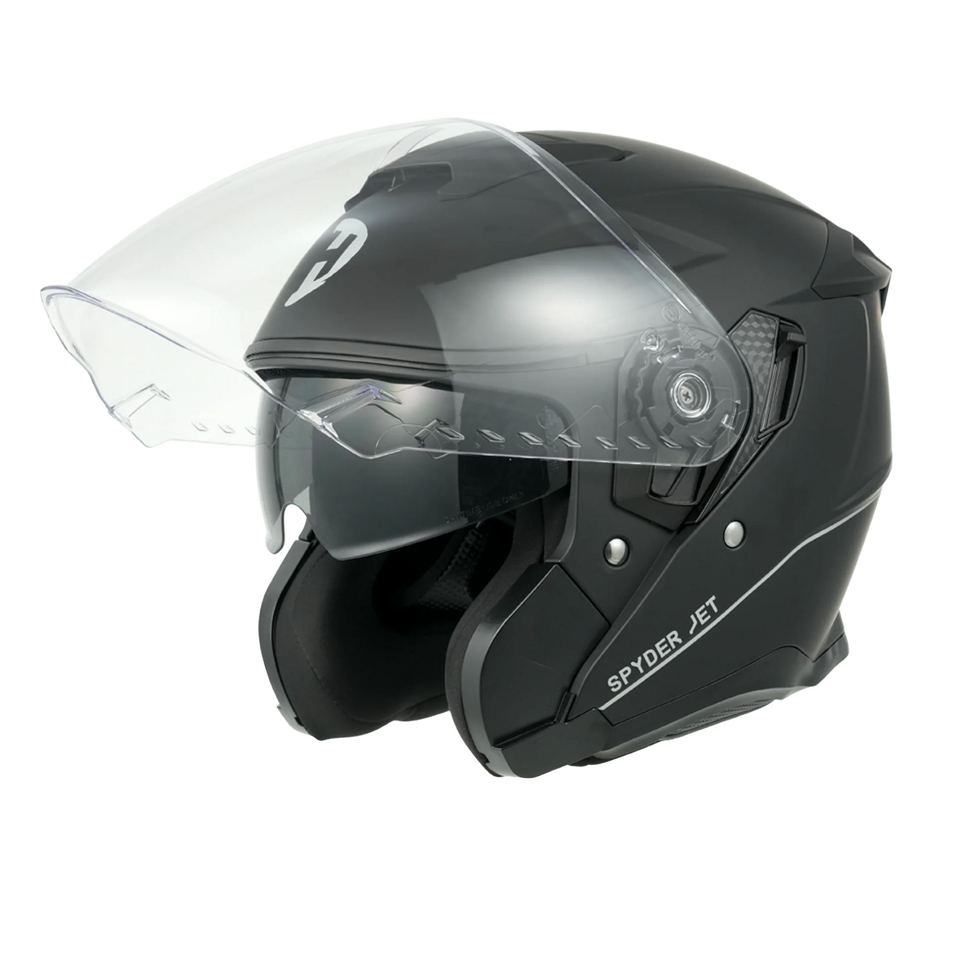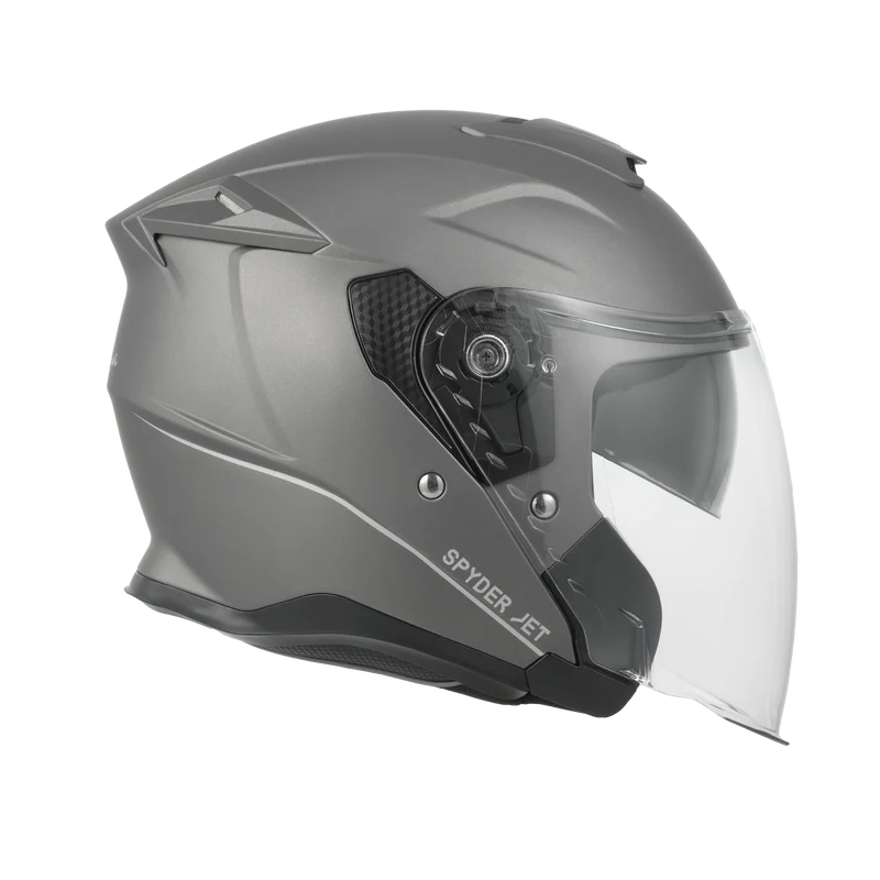 Our D.O.T. And ECE Daytona Spyder Jet Helmet In The Cool Grey Finish, Meets And Exceeds D.O.T. FMVSS 218 And ECE 22R06 Standards!! Features A Dual Shield System; Outer Anti-Scratch Clear Shield And Inner Anti-Scratch Retractable Smoke Shield. Also Has A Quick Release Lock Retention System; One Finger Release Lever For Easy Detachment And A Removable, Hand Washable Interior (Moisture Wicking Fabric). Bluetooth Compatible. Cloth Draw String Bag Included. Sizes Range From XS-2XL.